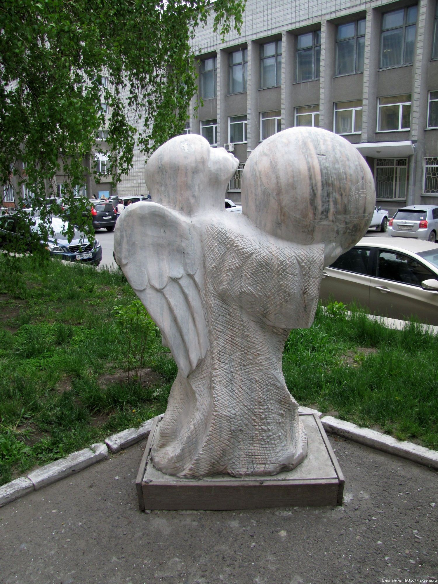 Скульптура «Ангел, ожидающий пробуждения человечества». Новосибирск. Пересечение Красного проспекта и улицы Гоголя. Расположился неподалеку от Дворца бракосочетаний Центрального района, чтобы давать установку брачующимся на счастливую семейную жизнь. Установлена в 2009 году после V симпозиума каменной скульптуры. Скульптор — Александр Парфёнов (Барнаул).