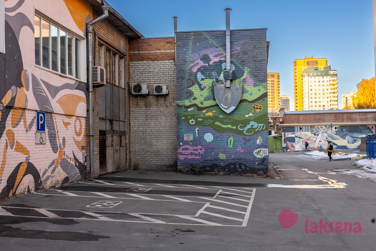 Эту работу нужно обязательно смотреть «живьём»! Ощущение абсурда, которое возникает при виде гигантской лопаты, однозначно гарантировано. Тема геологоразведки — сложная и объёмная. Суть дистанционное зондирование земли состоит в приеме данных со спутников, их регистрации, обработке и архивации. 3D-геологоразведка — это технология, которая позволяет на основе имеющейся информации о геологии региона с помощью математических и аналитических методов воссоздать процессы формирования и изменения геологических слоев, что дает возможность выявлять места залегания полезных ископаемых. Художники связали съёмку со спутников геологических пластов и робототехнику, которая точно знает, где и чем копать! Авторы росписи демонстрируют остроумие и смелое прочтение темы, когда сложные и, казалось бы, далёкие от повседневности процессы подаются в парадоксально-шуточном ключе.