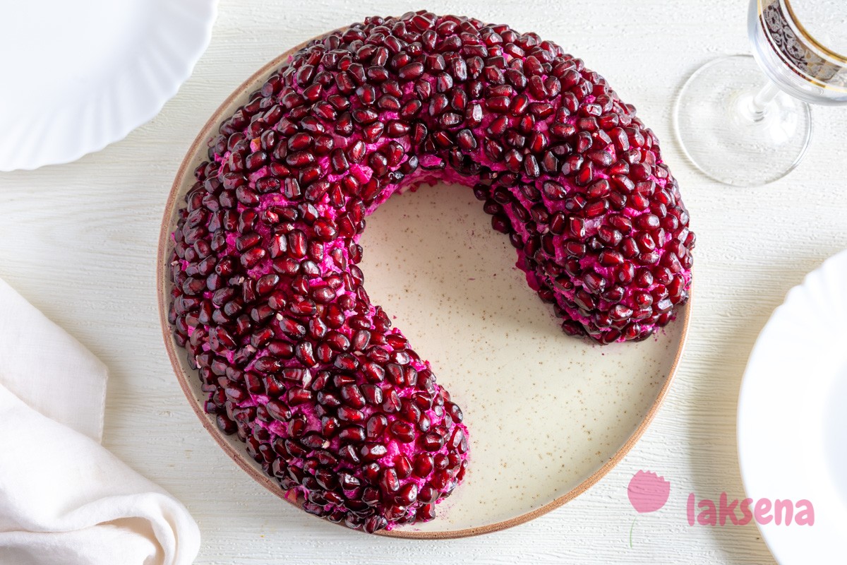 В центр большого плоского блюда поставить стакан. Вокруг него выложить салат в форме подковы. Сверху выложить зерна граната. Аккуратно убрать стакан.