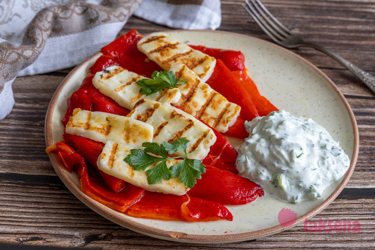 Салат из перцев и жареного халуми — потрясающе ароматный и очень простой в приготовлении салат. А огуречный соус Дзадзики прекрасно его дополняет.
