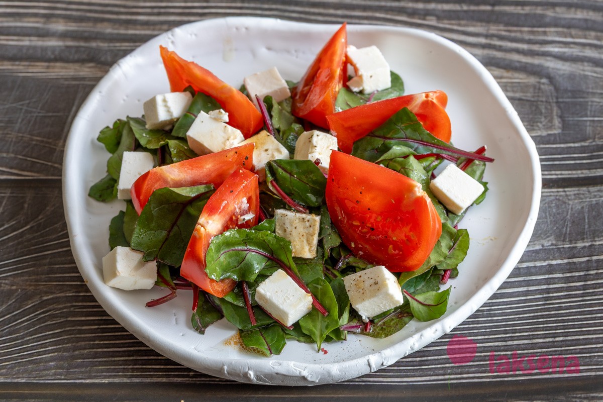 Итак, салат из листьев мангольда с помидорами и фетой готов. Приятного аппетита!