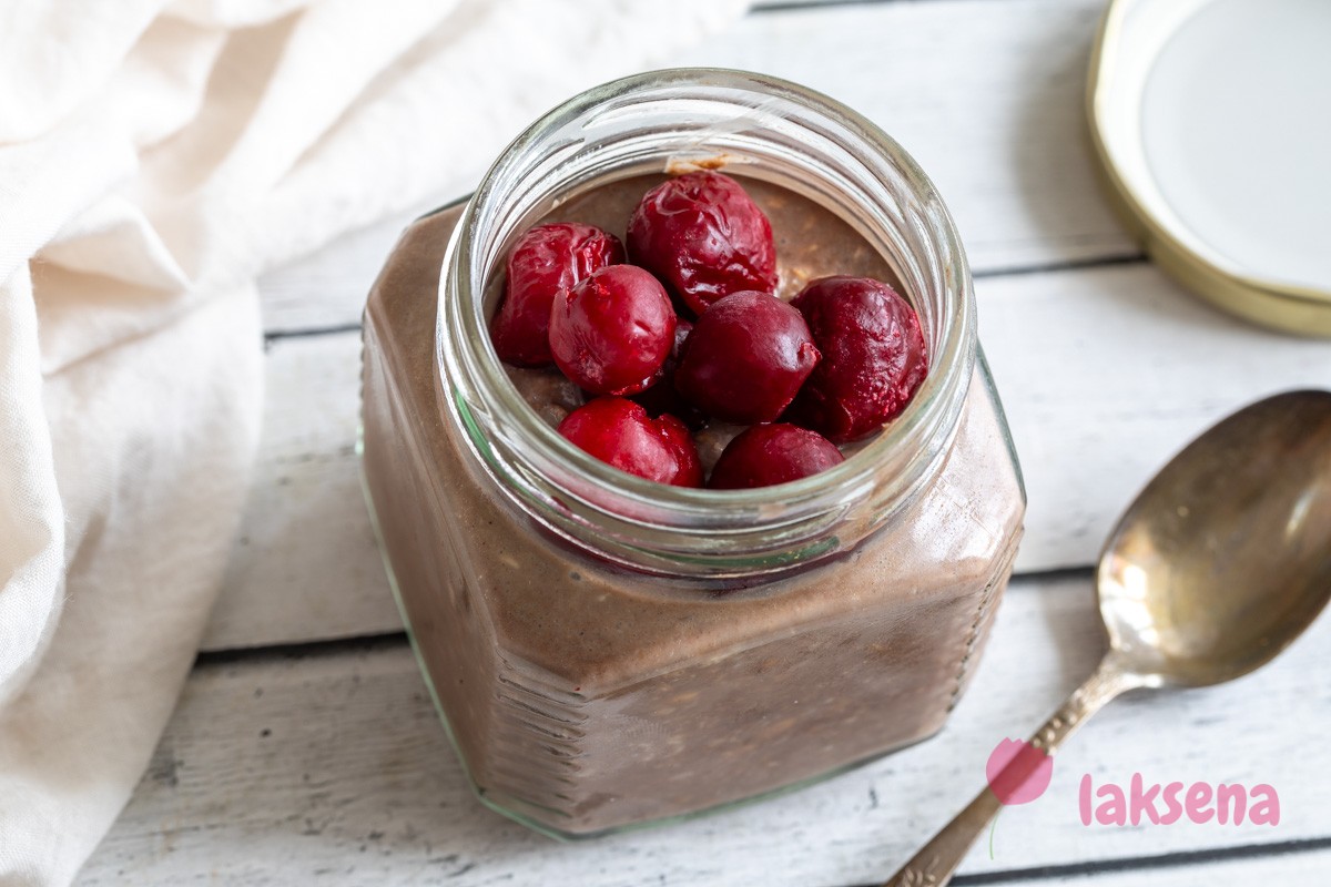Ленивая овсянка Вишня в шоколаде — это очень простое и оригинальное блюдо, к тому же — вкусное и полезное блюдо. Приготовление завтрака — нелюбимая многими рутина. Позаботьтесь об этом заранее — и тогда на следующий день понадобится только достать нужную баночку из холодильника. Кроме того, баночку можно взять с собой на работу или тренировку.