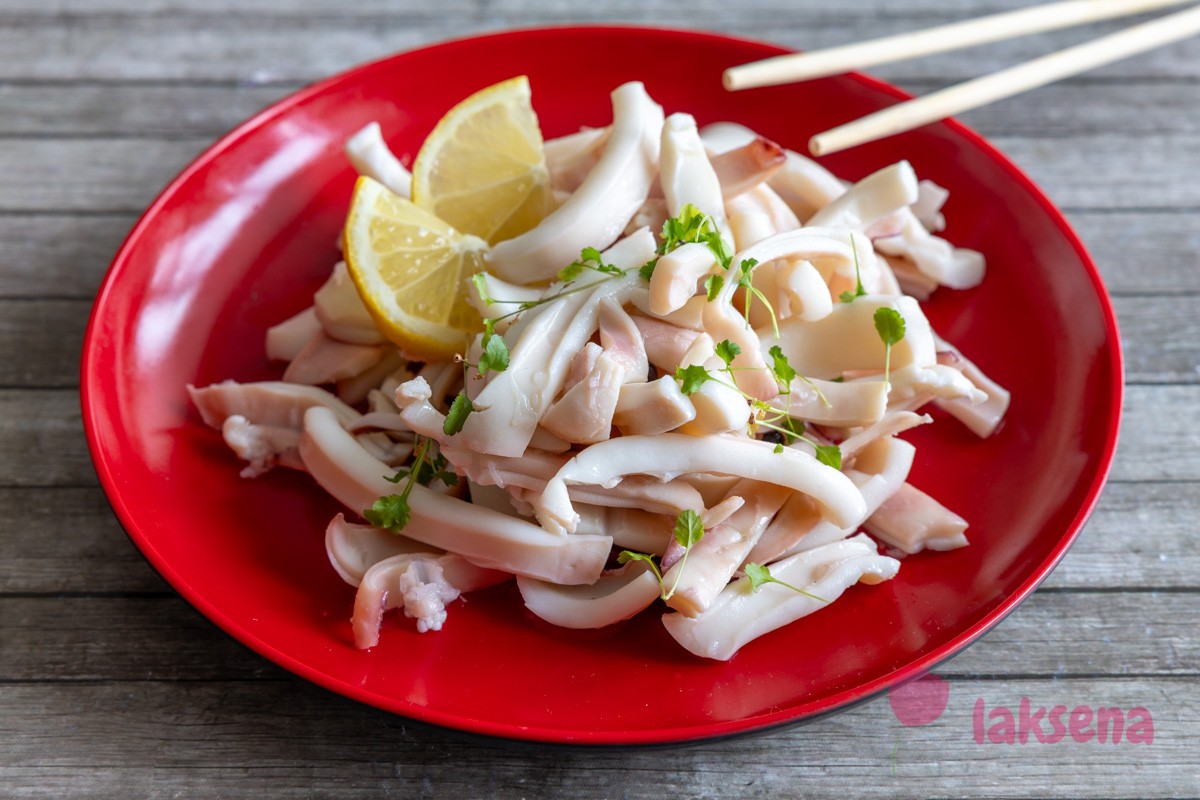 Готовые кальмары обязательно промыть под холодной проточной водой, снять остатки кожи, удалить внутренности и хитиновую пластину.